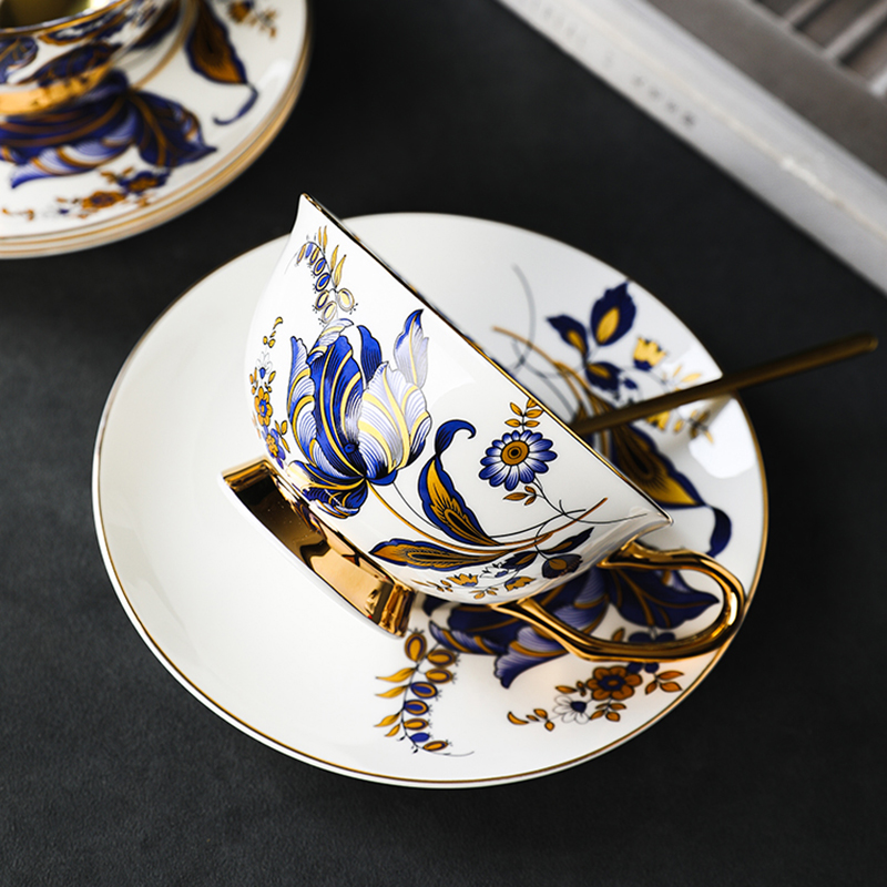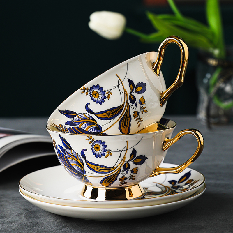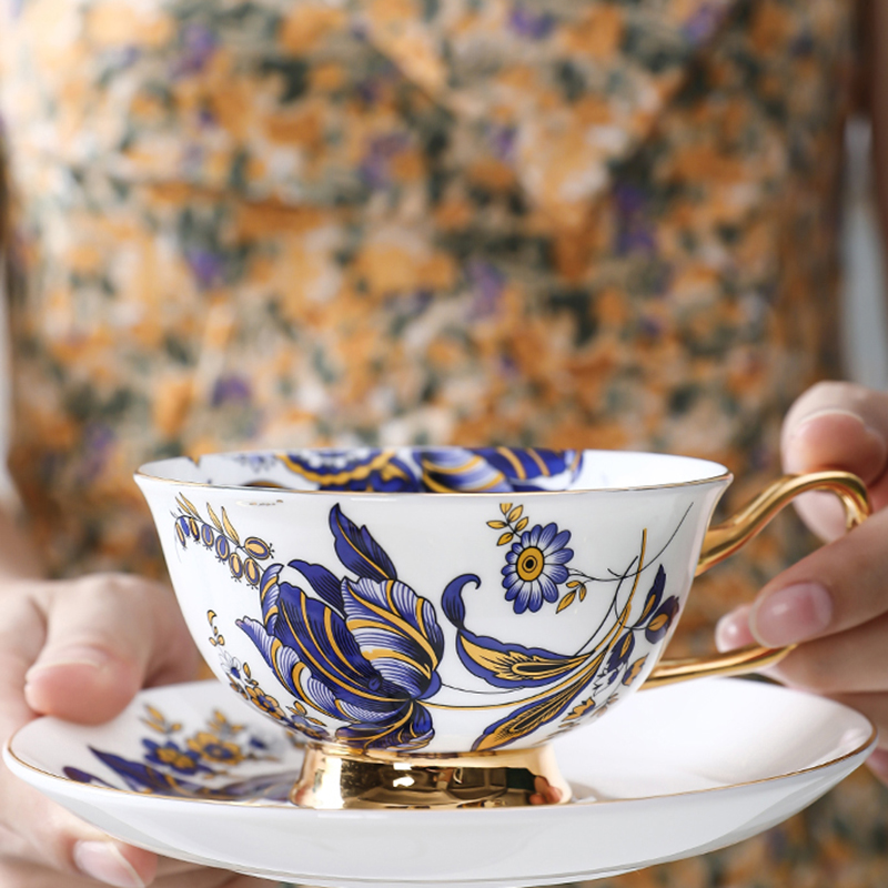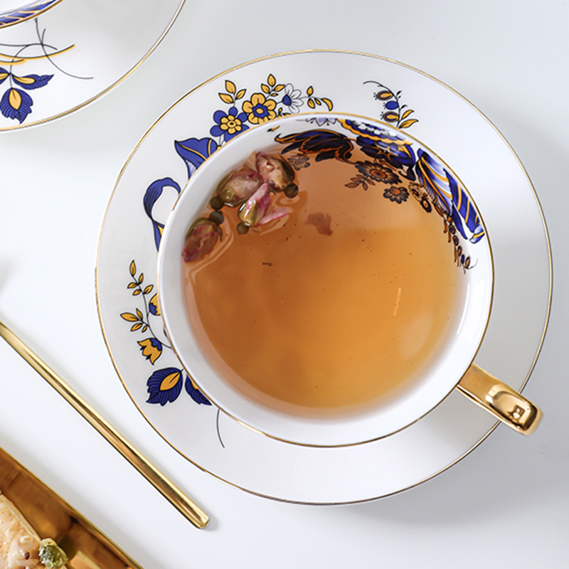 Uncover the captivating highlights of our Blue Floral Tea Cup Set, a masterpiece in both aesthetics and resilience. Crafted from high-quality bone china, each cup and saucer boasts a smooth surface that radiates both beauty and durability. The inner surface of the cups is adorned with equally stunning patterns, creating an immersive visual experience while you savor your tea. The gold accents on the cup handle add a luxurious touch, turning every tea-drinking moment into a celebration of elegance. Immerse yourself in the enduring charm of this bone china collection, designed to withstand the test of time and infuse your tea rituals with lasting beauty.