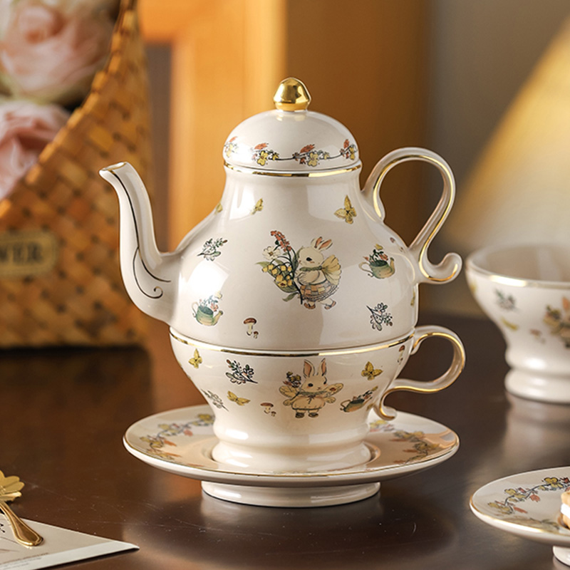 Step into a world where whimsy meets elegance with our Bunny Tea Set for One, a delightful addition to your tea collection that captures the essence of English cartoon charm. Featuring an adorable bunny cradling a flower, with butterflies and additional floral accents adding to the enchantment, this set turns every tea time into a magical moment. Crafted with attention to detail and a nod to luxury, its unique design and high-quality porcelain construction make it a must-have for those who cherish the fusion of artistry and function in their tableware.