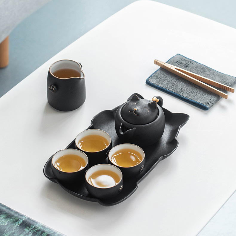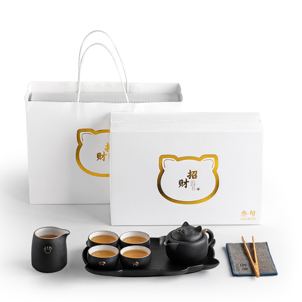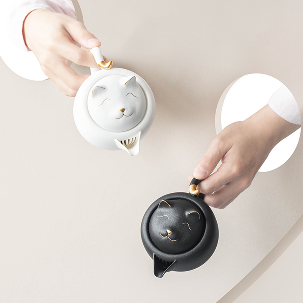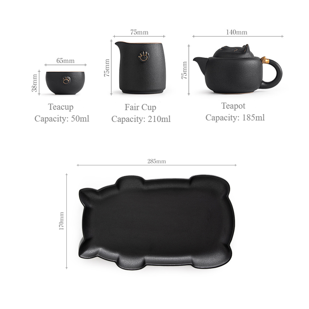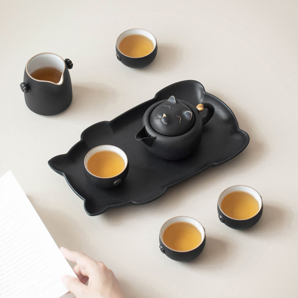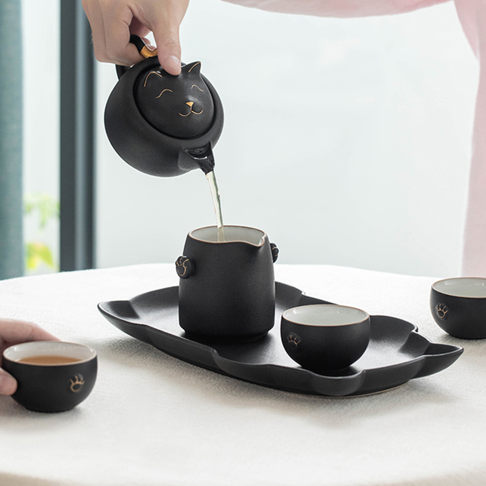 Indulge in the perfect cup of tea with this adorable cat-shaped gongfu tea set. This tea set is inspired by the legend of the cute cat. The teapot has a cat-shaped lid, the Gaiwan and cups have cat paw patterns, and the tea tray is in the shape of a cat. It is a unique and stylish way to enjoy a cup of tea.