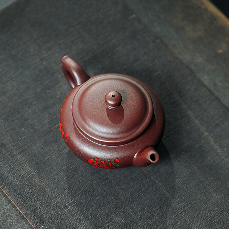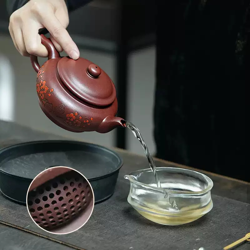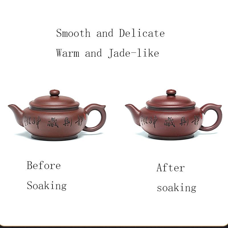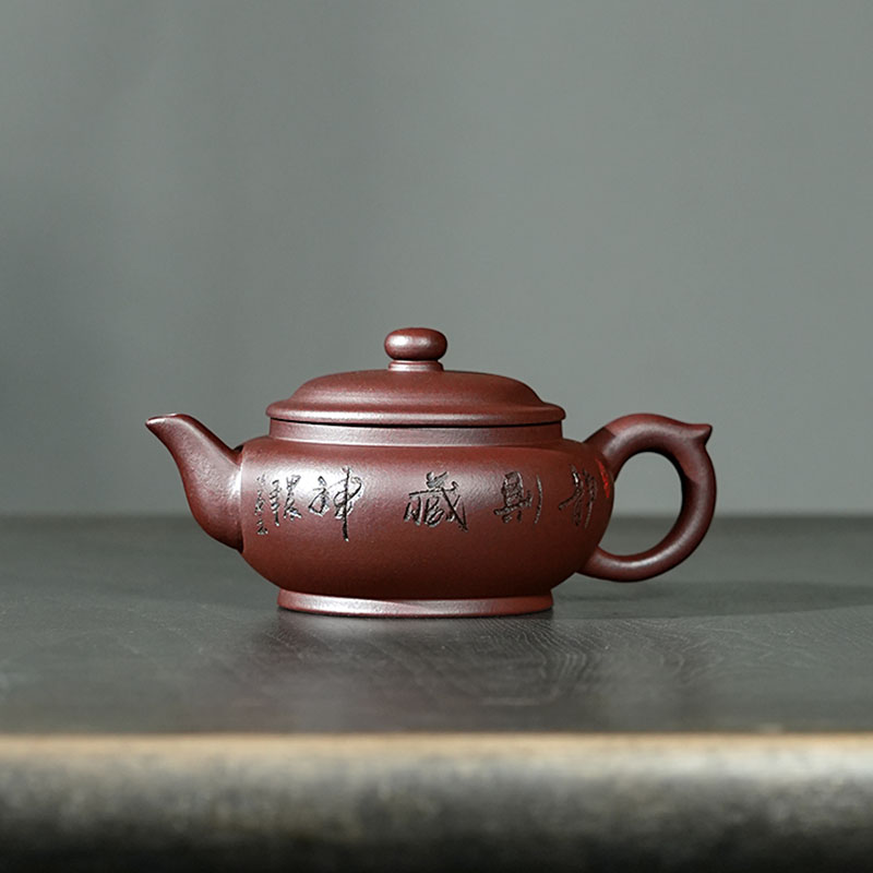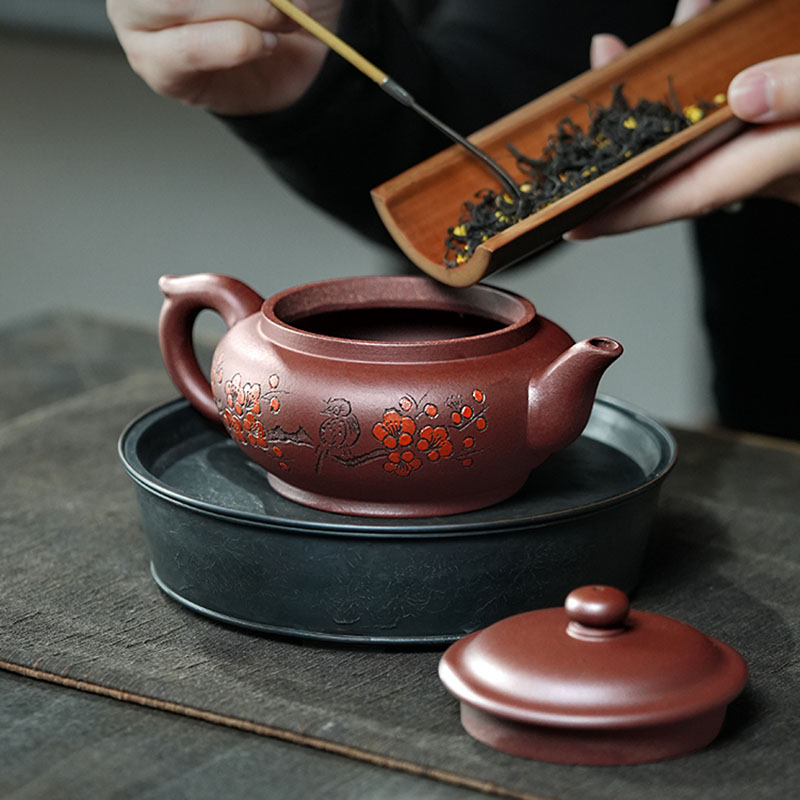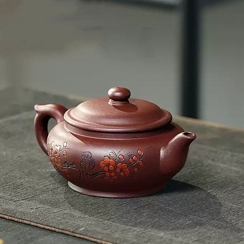 The teapot showcases the classic flat-belly (bianfu) shape, offering a generous capacity, a full, rounded silhouette, and a comfortable grip. Designed for a smooth and steady pour, it exudes balance and harmony. The front is engraved with the Chinese words meaning “Tranquility Nourishes the Spirit” while the back features a delicate engraving of plum blossoms and birds, evoking the spirit of the East.