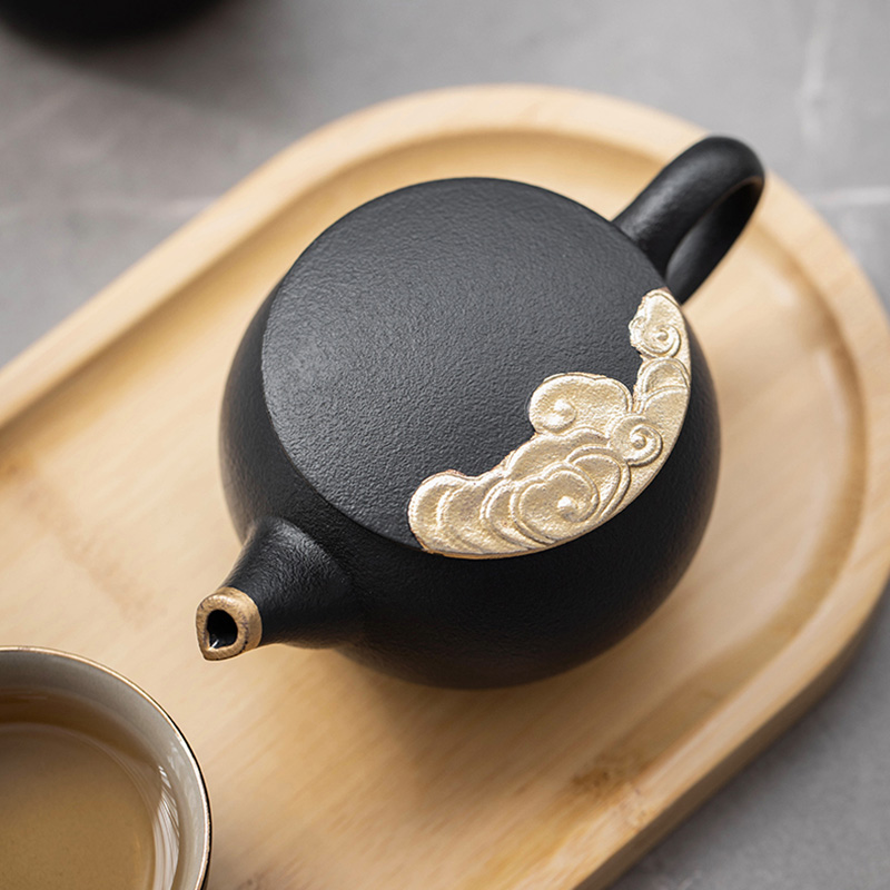 - Teapot lid adorned with a golden cloud pattern, symbolizing beauty and depth.