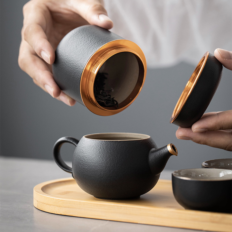 Elevate your tea experience with our Cloud Chinese Travel Tea Set, meticulously crafted from premium ceramic. This luxurious set includes a teapot, four teacups, and a tea leaf canister, each adorned with exquisite gold trim, exuding a sense of luxury. The teapot lid is decorated with a golden cloud pattern, adding a touch of poetic beauty and depth to its design. Perfect gift for Gongfu tea lovers, ideal for on-the-go enjoyment.