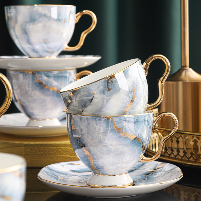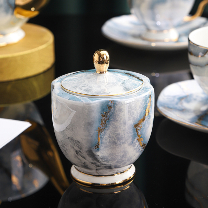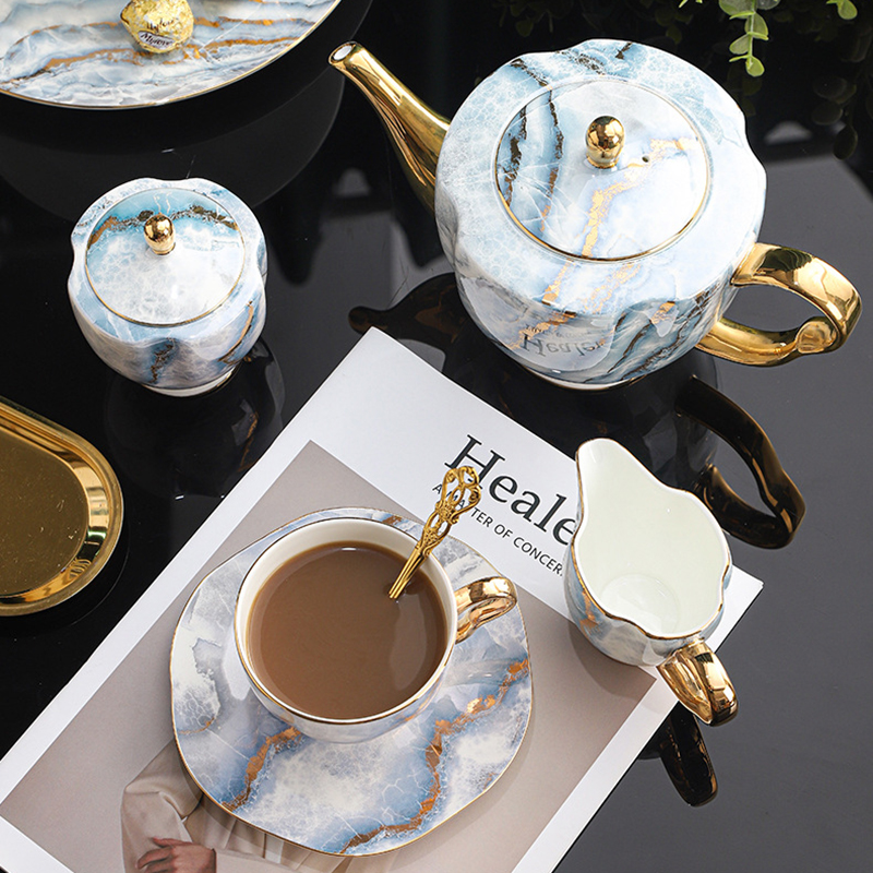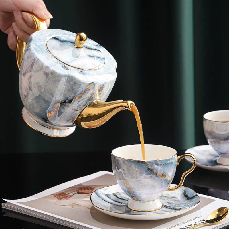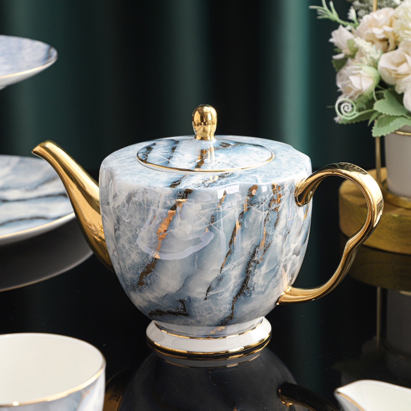Introducing the Exquisite English Tea Set, a modern masterpiece designed to blend seamlessly into the sophisticated spaces of contemporary homes. Crafted from premium bone china, this set stands out with its striking marble pattern that evokes the natural beauty of stone, enhanced by the luxurious sheen of the porcelain. This 15-piece set is a true testament to modern design sensibilities, combining functionality with aesthetic appeal.