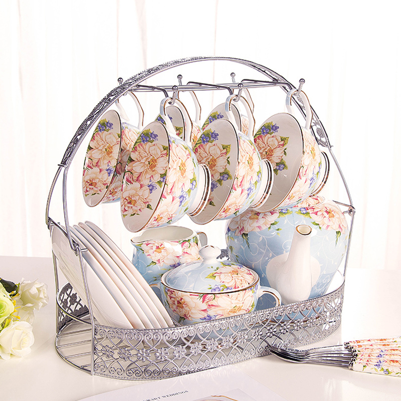 This tea set is available in two charming colors: blue and pink. Each set includes 15 pieces of tea ware, along with a rack holder stand for convenient storage.