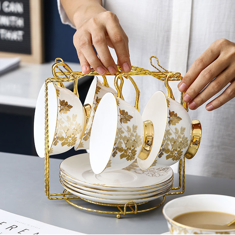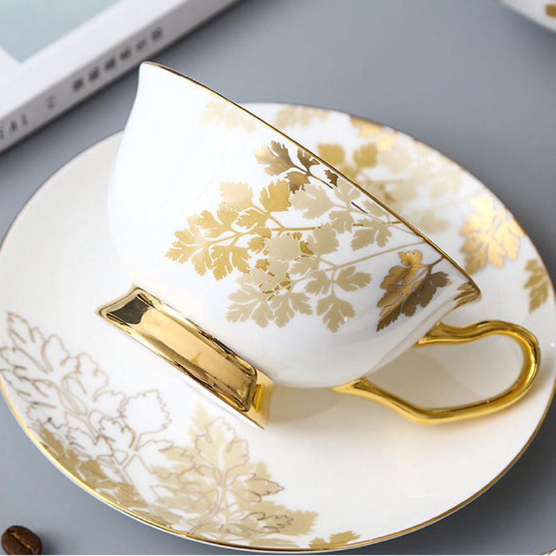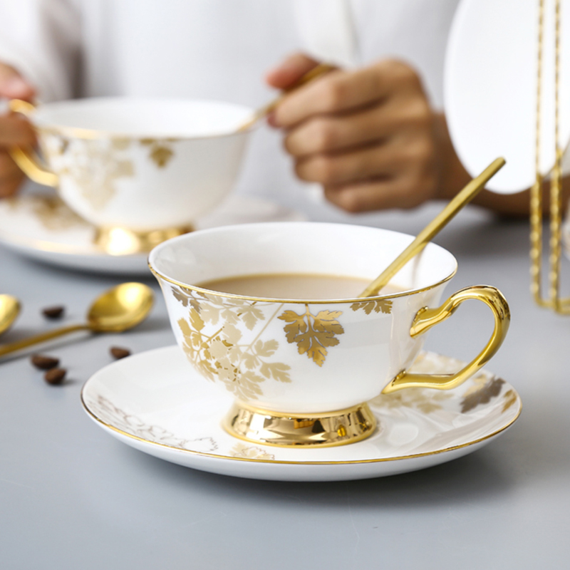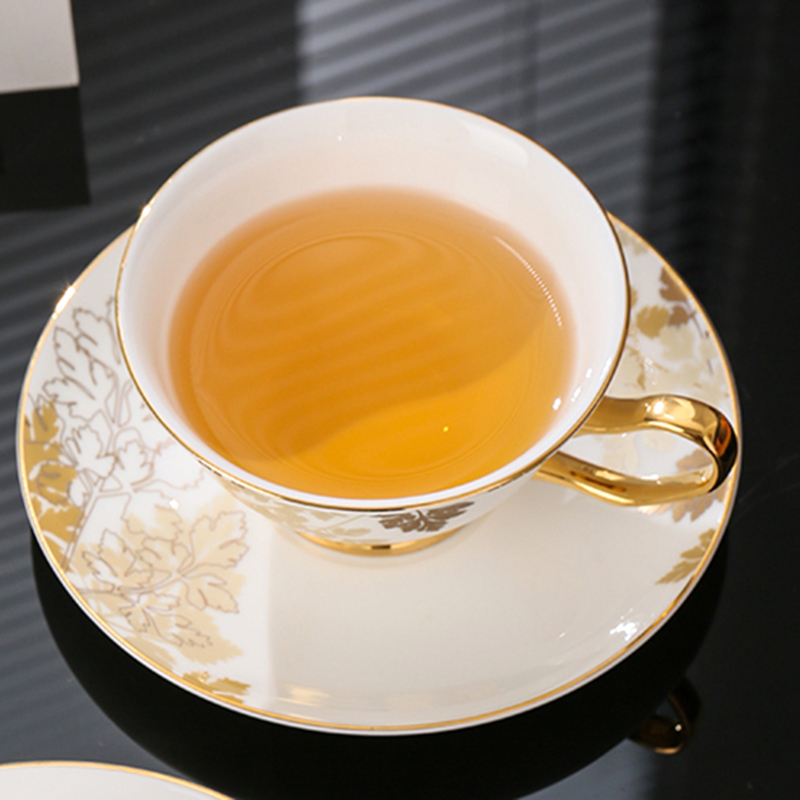 Discover the epitome of luxury in our Gold Leaf Tea Cup and Saucer Set, meticulously fashioned from premium bone china. The intricate gold leaf design, meticulously applied by skilled artisans, captivates the eye and transforms tea time into a moment of sheer elegance. The set’s gold handles not only add a touch of opulence but also provide a comfortable grip, enhancing the overall user experience. The flawless surface, a testament to exquisite craftsmanship, ensures a smooth touch and easy maintenance. The versatility of our set shines through in its multiple configurations, catering to your individual preferences – whether it’s an intimate solo experience or a delightful gathering of four or six. Elevate your tea-drinking ritual with this stunning set that seamlessly combines artistic craftsmanship with practicality.