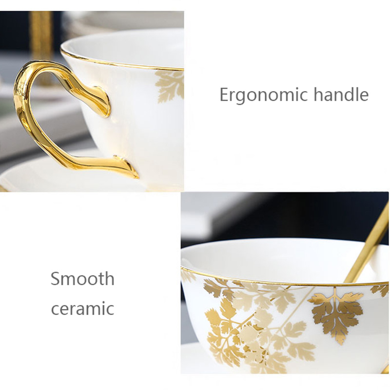 Indulge in the refined charm of our Gold Leaf Tea Cup and Saucer Set, meticulously crafted from high-quality bone china. Immerse yourself in the exquisite allure of hand-applied golden maple leaf patterns that adorn the smooth surface, evoking the beauty of a picturesque autumn. The craftsmanship exudes sophistication, while the easy-to-clean surface ensures convenience. Available in various combinations, including serve for 1, serve for 2, serve for 4, and serve for 6, this set effortlessly elevates your tea rituals to a new level of sophistication. Embrace the season’s magic and make every sip a luxurious affair.