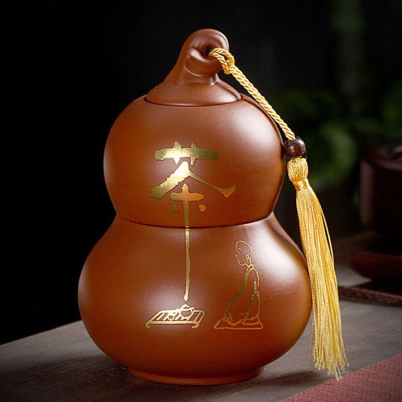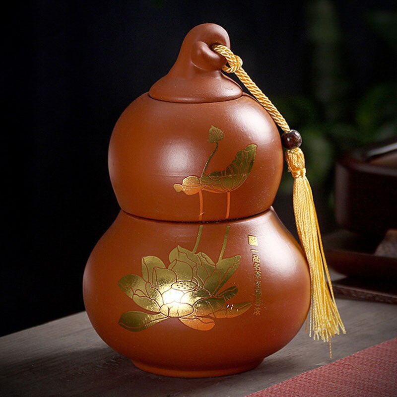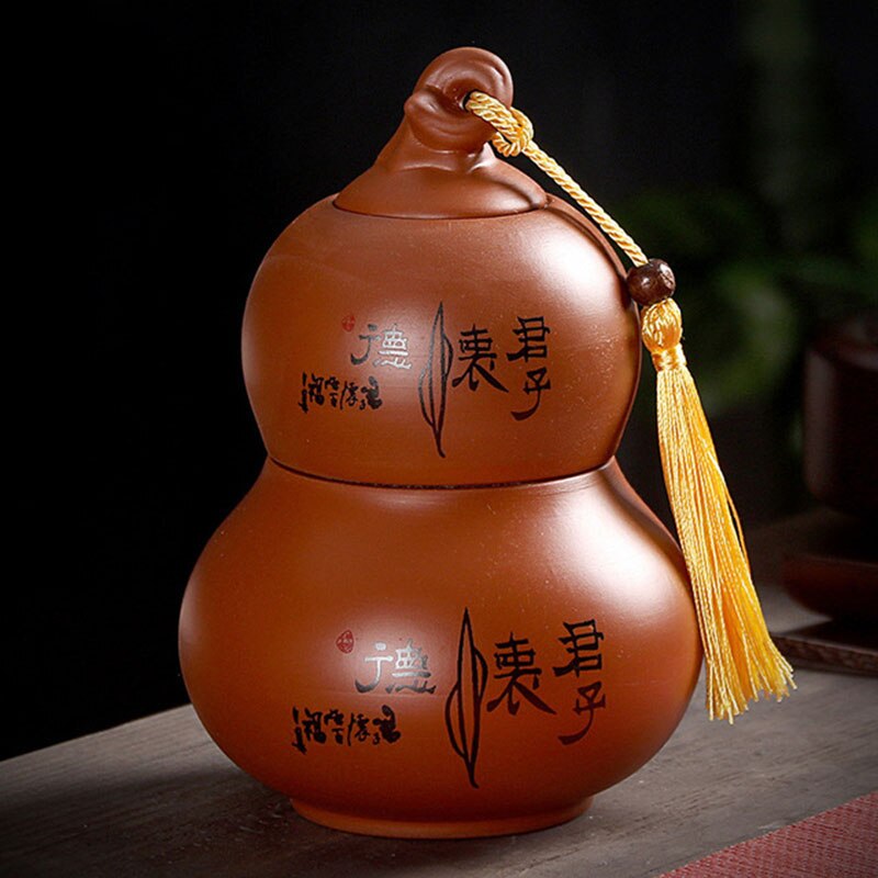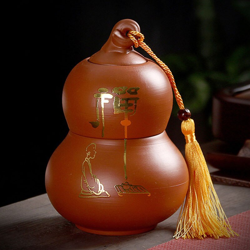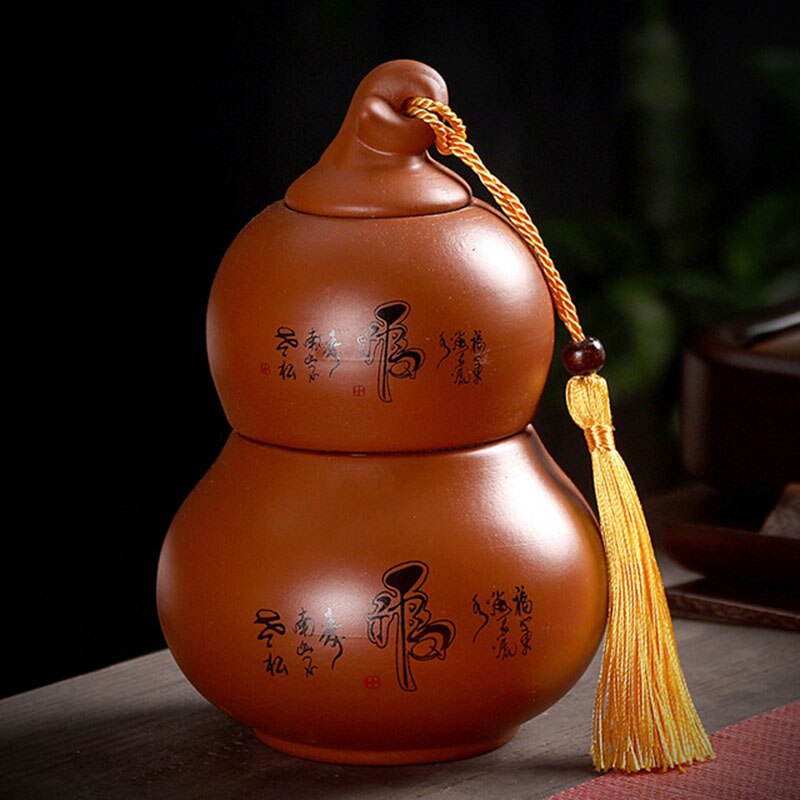 This is a gourd-shaped tea caddy made of ceramic ware with a very Zen-like patterned exterior ceramic ware tea caddy is an elegant way to keep your tasteful tea leaves safe and sound. It is the perfect gift for your family and friends who love to enjoy traditional Chinese tea. It is also a great idea to give it to those who like to care for their health. Please hurry up to get it!