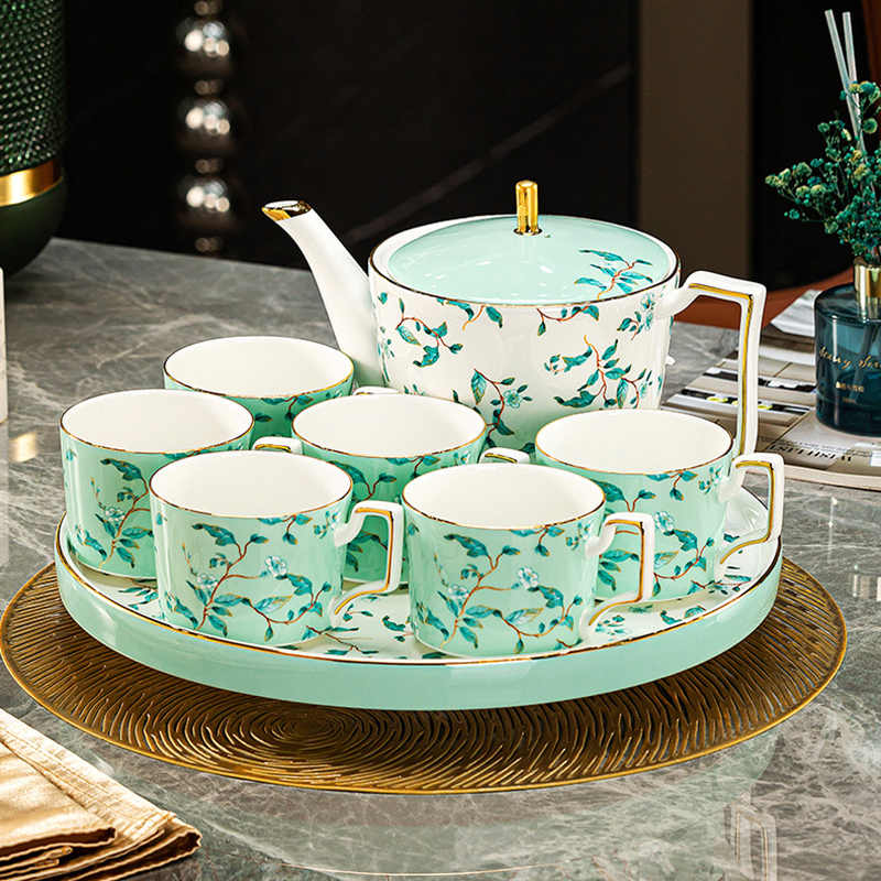 Transform your tea moments into an enchanting experience with our Green Leaf Tea Set Porcelain Teapot Set, complete with a captivating tray. Immerse yourself in the soothing hues of light green as the background, adorned with exquisite leaf patterns that evoke the beauty of nature. Crafted from high-quality ceramic and fired at high temperatures, this set radiates a pristine translucence. The set comes complete with a creatively designed ceramic tray, allowing for rotation and adding a versatile touch. With its high aesthetic appeal and elegant design, this tea set effortlessly captures attention, making it the perfect statement piece to elevate your tea gatherings with a touch of sophistication.