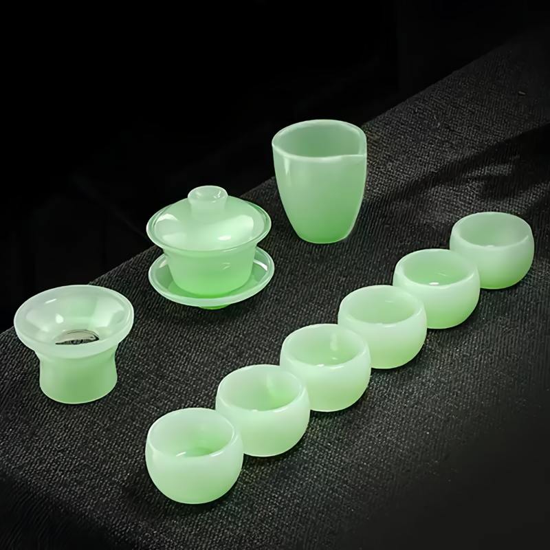 Bring timeless elegance to your tea experience with our Liuli Glass Chinese Gongfu Tea Set. Crafted from exquisite, jade-like liuli glass, this Gaiwan tea set radiates a soft, warm glow, offering a perfect balance of sophistication and tranquillity for your tea rituals.