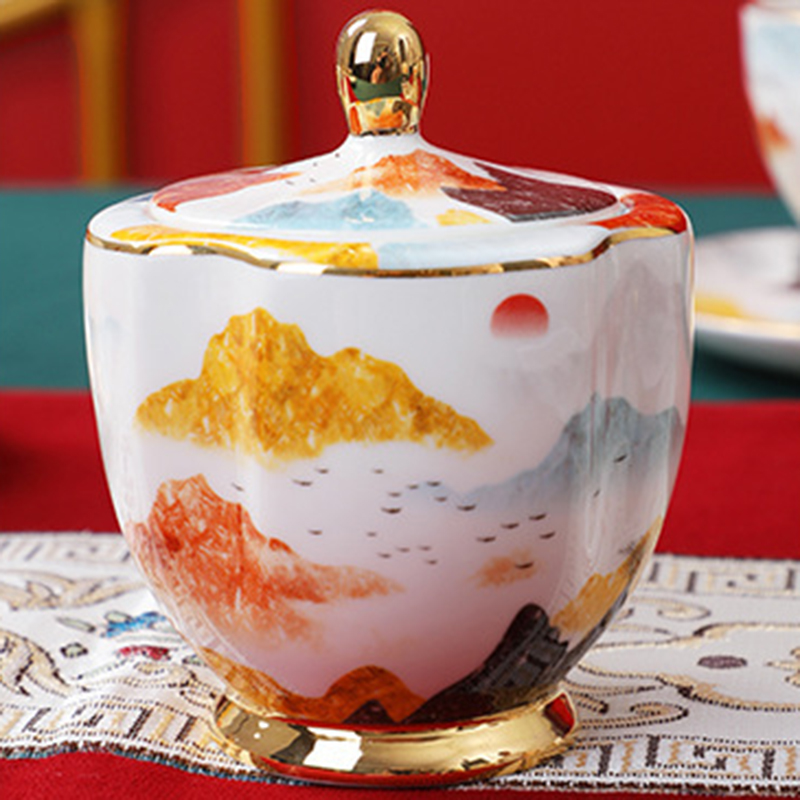 Step into a world where East meets West with our Mountain-range English Tea Set, crafted from the finest bone china. This luxurious set brings a unique fusion of traditional English tea culture and Chinese artistic aesthetics. The set’s design features an exquisite mountain range motif that symbolizes the majestic beauty of the East, presented on a backdrop that blends seamlessly with the Western tradition of tea drinking.