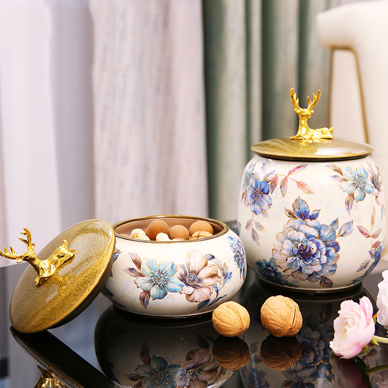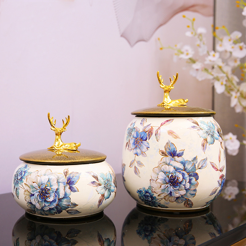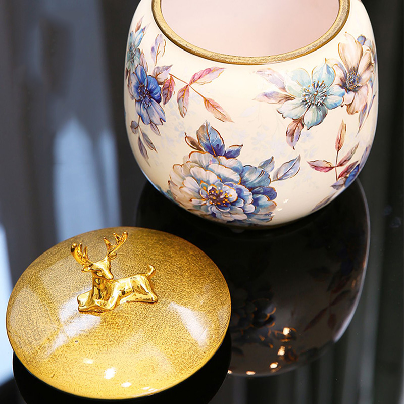 This Peony Tea Caddy Ceramic Loose Tea Tin perfectly combines functionality and beauty. Made with high-quality ceramic material, this tea tin is adorned with a beautiful peony flower pattern on a crisp white background, adding an elegant touch to your tea-drinking experience. The round-shaped tin has a gold deer-shaped lid that looks beautiful and provides an airtight seal, keeping your loose tea fresh and aromatic for a long time. It’s perfect for any living room or tea-drinking space and will enhance your surroundings’ classical ambiance and beauty.