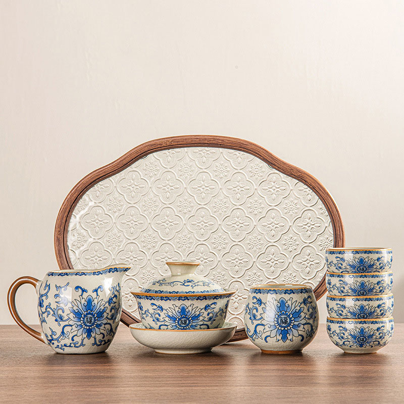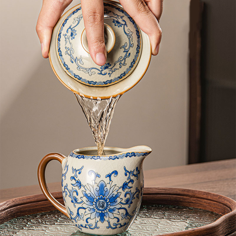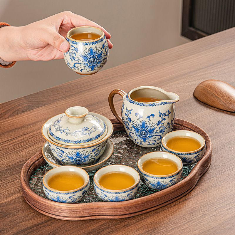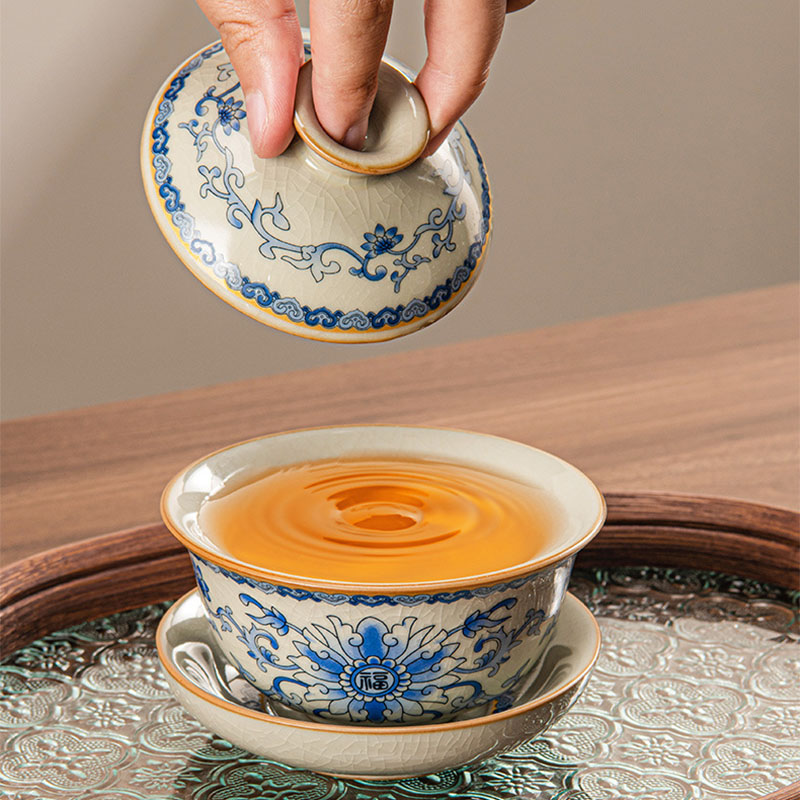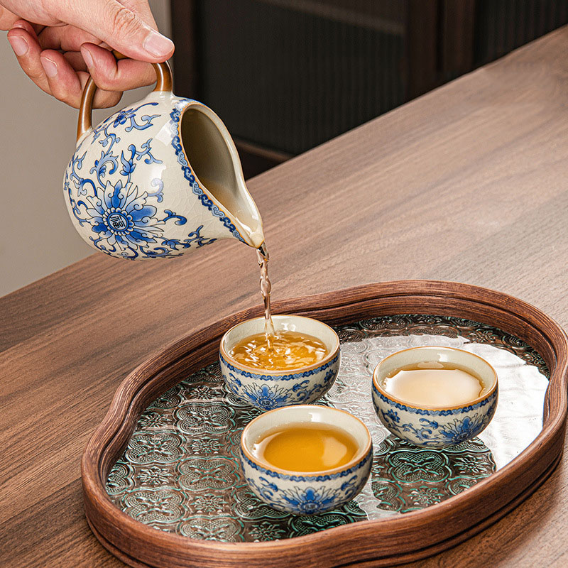 The Gaiwan is carefully designed for easy handling and smooth pouring, preserving the delicate flavors of your tea. The matching tea cups echo the graceful blue floral motif, offering a harmonious aesthetic, while the beautifully embossed glass tea tray provides a sturdy yet elegant base, blending functionality with timeless artistry.