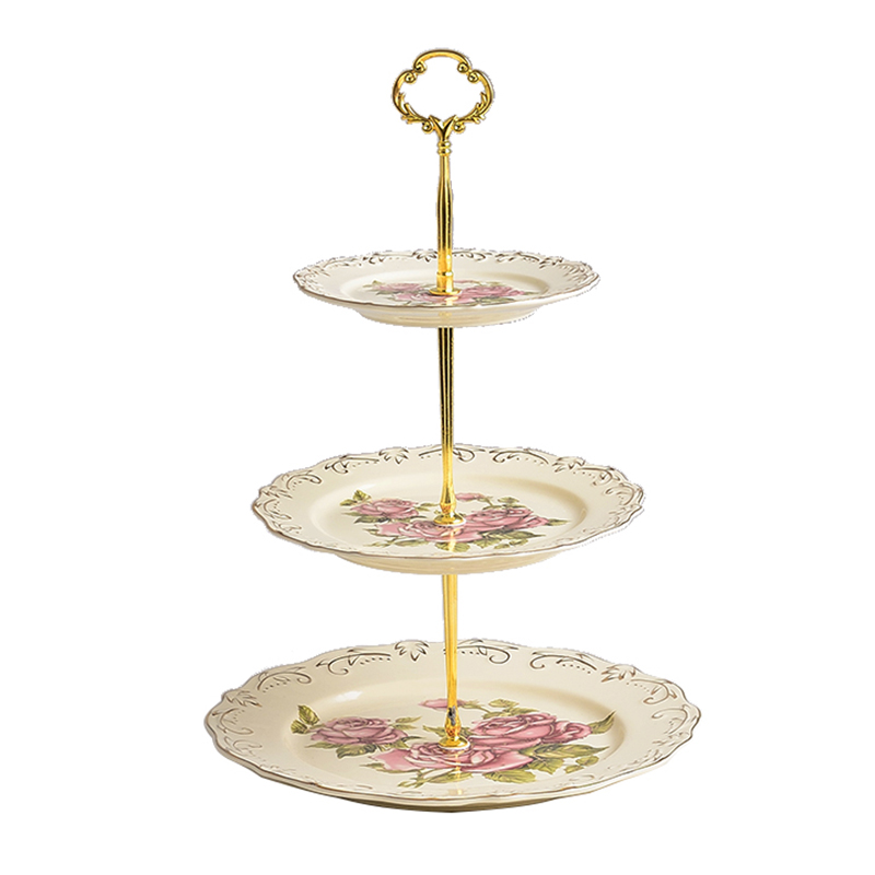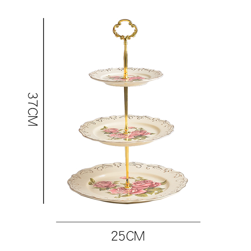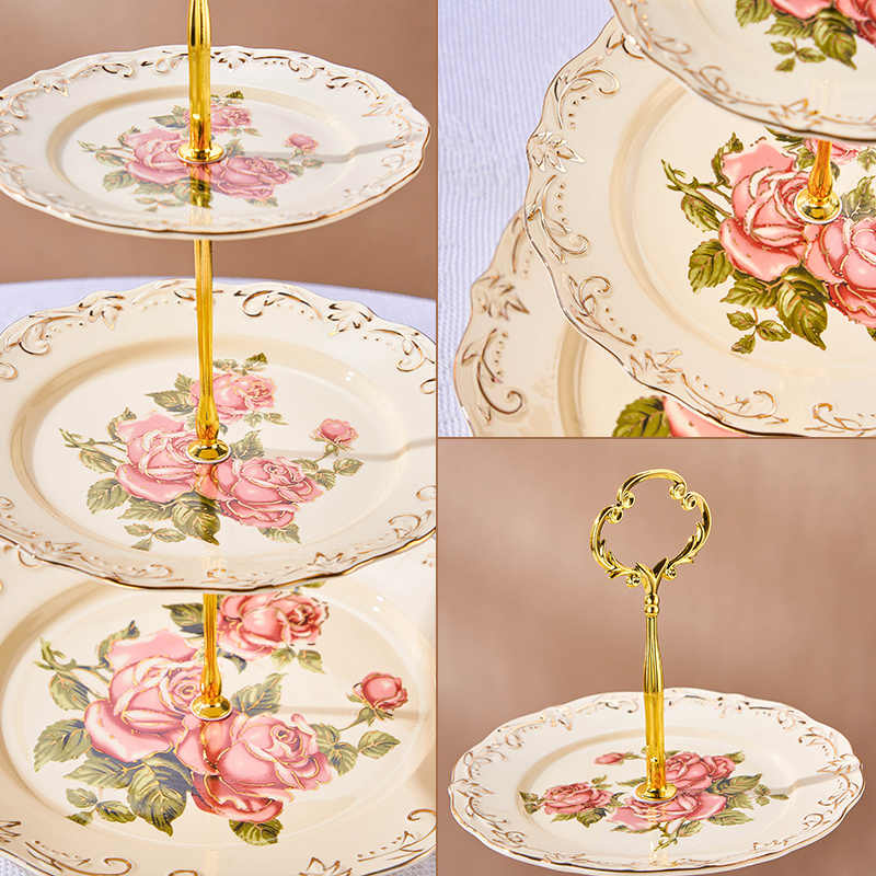 This Vintage Rose Cake Stand combines timeless elegance with practical design, making it a perfect addition to any table setting. Crafted from premium porcelain, the three-tiered stand features a delicate vintage rose pattern, accentuated by elegant edges that exude sophistication. Its sturdy golden metal pole not only ensures durability but also adds a touch of luxury. The spacious three-layer design provides ample room to beautifully display cakes, fruits, or pastries, making it ideal for afternoon tea, weddings, birthday parties, and other gatherings. The convenient top handle allows for easy portability, making this stand as functional as it is beautiful. Whether hosting an elegant event or decorating your home, this cake stand is sure to impress.